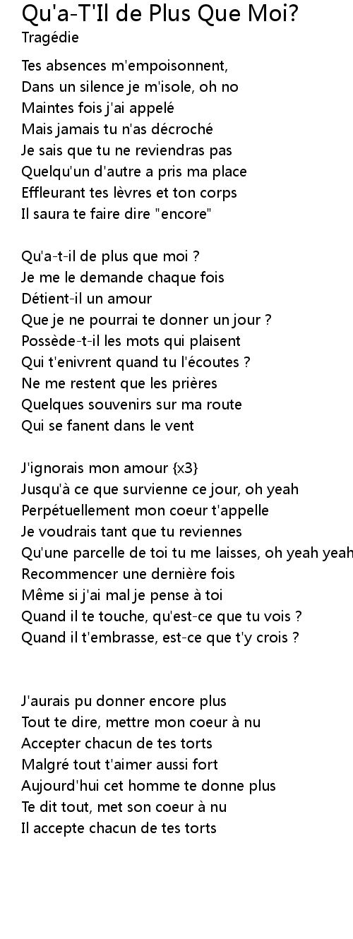 | Song | Qu'a-T'Il de Plus Que Moi? |
