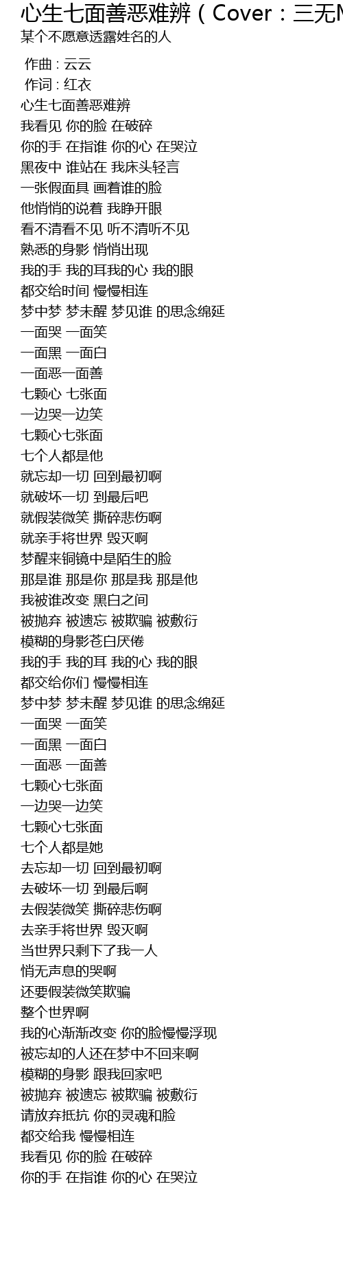 | Song | 心生七面善恶难辨(Cover:三无MarBlue) |