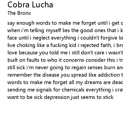 say enough words to make me forget until i get dangerous and desperate i love it when i'm telling myself lies the good ones that i know i can cash stare at my face until i neglect everything i couldn't forgive look at the way you make me live choking like a fucking kid i rejected faith, i broke a good heart i regret love because you told me i still don't care i wasn't meant to cover up scars built on faults to who it concerns consider this i tried all your cures but i'm still sick i'm never going to regain senses burn another hole in my head remember the disease you spread like addiction that comes in fits talk enough words to make me forget all my dreams are dead disguise lack of progress quit sending me signals for chemicals everything i crave is going to kill me don't want to be sick depression just seems to stick |