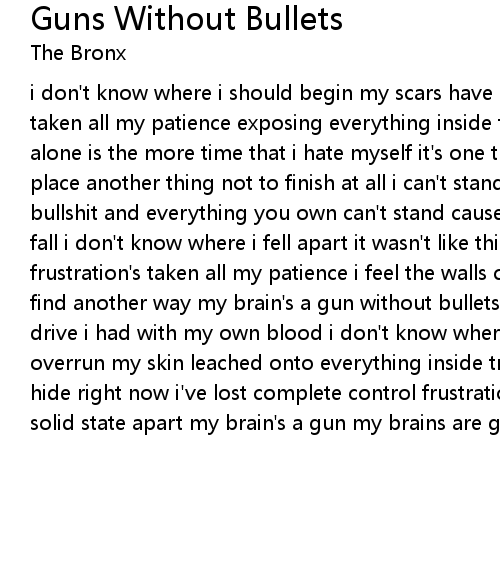i don't know where i should begin my scars have overrun my skin frustration's taken all my patience exposing everything inside the more time that i spend alone is the more time that i hate myself it's one thing not to finish in first place another thing not to finish at all i can't stand here and listen to bullshit and everything you own can't stand cause i live alone watching shadows fall i don't know where i fell apart it wasn't like this from the start frustration's taken all my patience i feel the walls closing each day i try to find another way my brain's a gun without bullets so sad i can't replace the drive i had with my own blood i don't know where i should begin my scars have overrun my skin leached onto everything inside try and find a darker place to hide right now i've lost complete control frustration stole my dedication rip my solid state apart my brain's a gun my brains are gone |