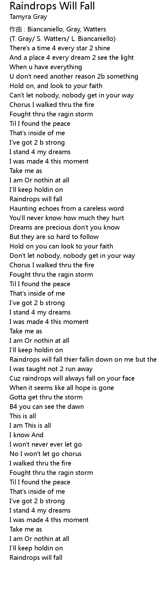 | Raindrops will fall thier fallin down on me but the sun is gonna shine | |