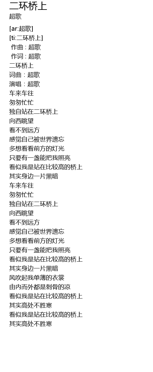 | [02:00.54] | dú zì zhàn zài èr huán qiáo shàng |