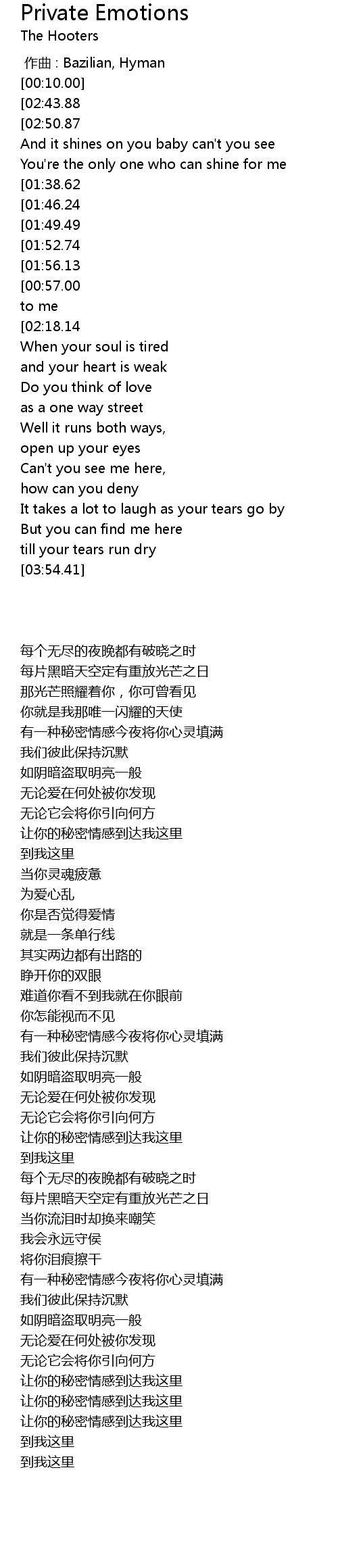 | [01:58.58][00:57.00][03:29.61][03:36.78][03:42.51] | Let your private emotion come to me |