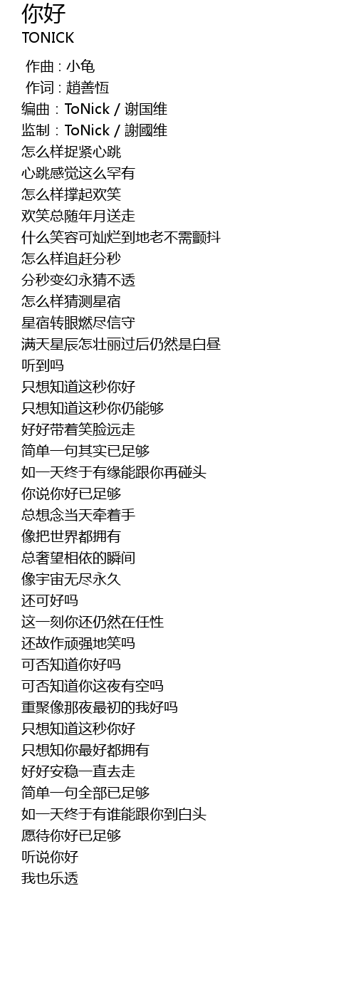 | [00:00.96] | 编曲:ToNick / 谢国维 |
