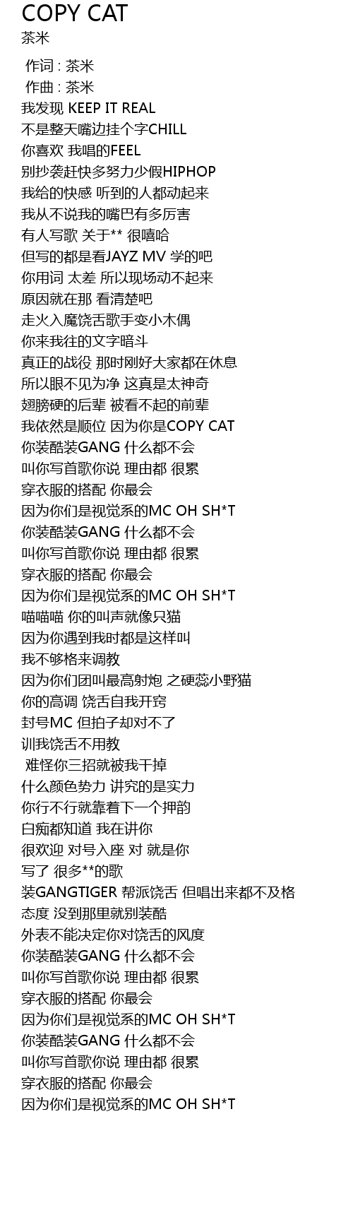 | [00:53.16] | 我依然是顺位 因为你是COPY CAT |