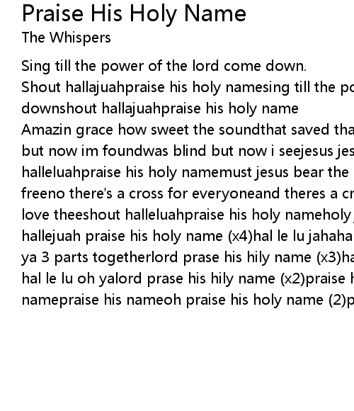 Amazin grace how sweet the soundthat saved that wrench like mei once was lost but now im foundwas blind but now i seejesus jesus how i love theeshout halleluahpraise his holy namemust jesus bear the cross aloneand all the world go freeno there's a cross for everyoneand theres a cross for mejesus jesus how i love theeshout halleluahpraise his holy nameholy jesus praise his nameoh hallejuah praise his holy name (x4)hal le lu jahahapraise his name hal le lu oh ya 3 parts togetherlord prase his hily name (x3)hal le lu jahahapraise his name hal le lu oh yalord prase his hily name (x2)praise his namepraise his holy namepraise his nameoh praise his holy name (2)prase him |