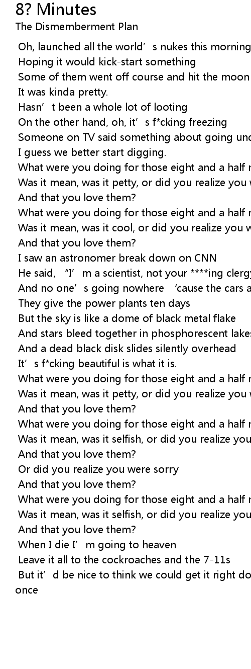 | [00:06.911] | Oh, launched all the world' s nukes this morning |