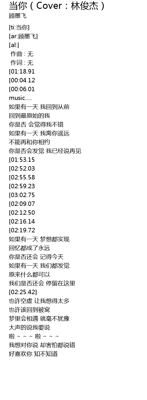 | [03:52.94][01:18.91][00:00.87] | 顾墨飞 - 当你 |