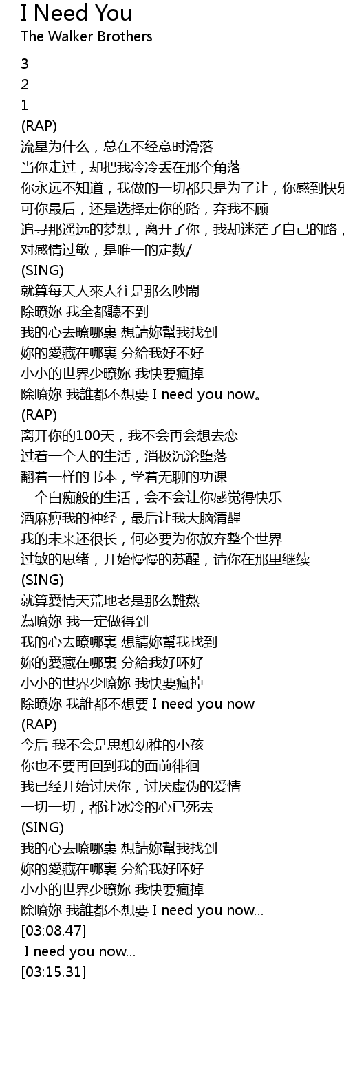 | [03:00.86] | 除暸妳 我誰都不想要 I need you now... |