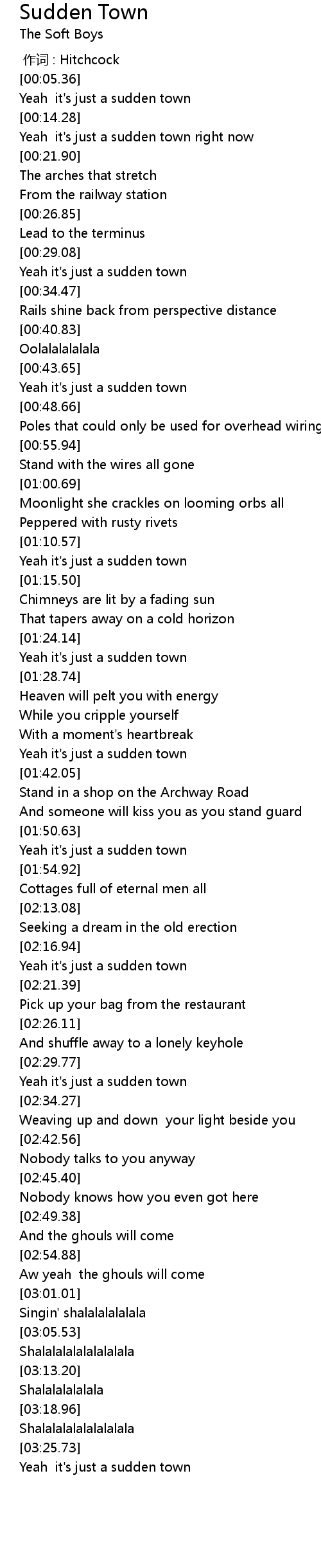 | [00:17.64] | Yeah it's just a sudden town right now |