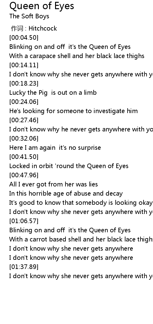 | [00:07.15] | Blinking on and off it's the Queen of Eyes |