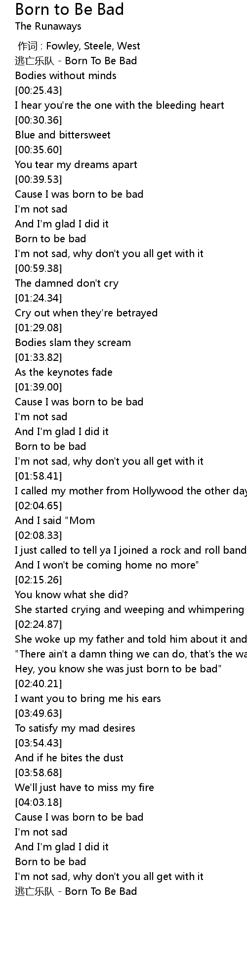 | [02:34.97] | Hey, you know she was just born to be bad" |