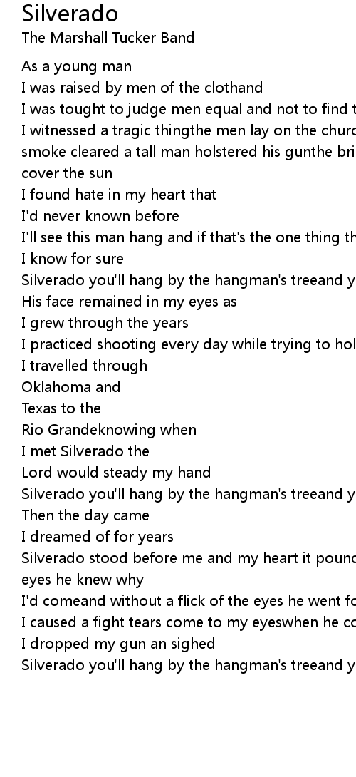 Silverado stood before me and my heart it pounded in fearas he turned and saw my eyes he knew why |