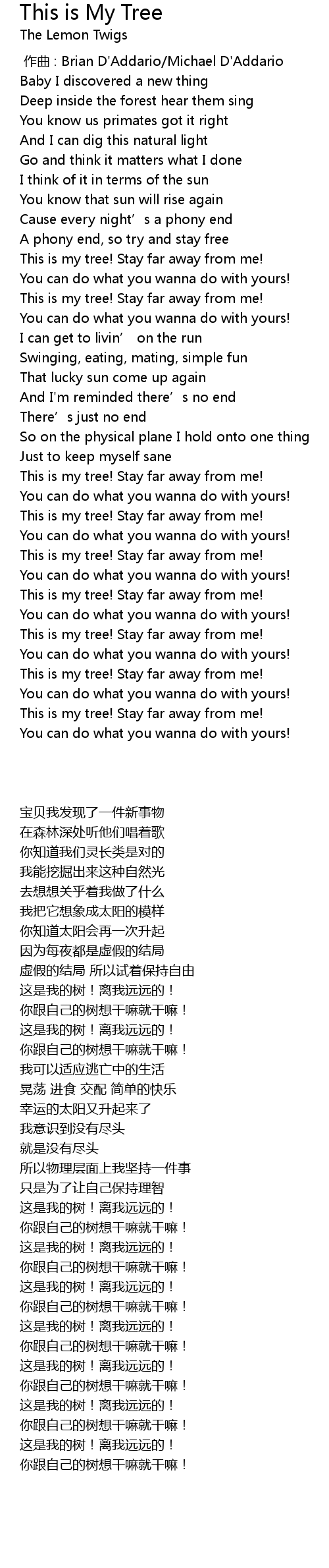 | [02:23.63] | This is my tree! Stay far away from me! |