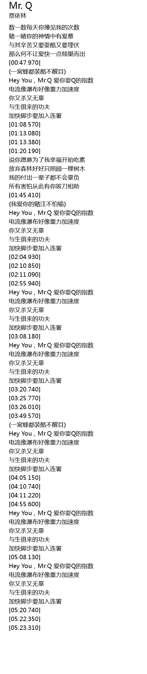 | [04:55.700] | Hey You, Mr. Q ài nǐ shuǎ Q de zhǐ shù |
