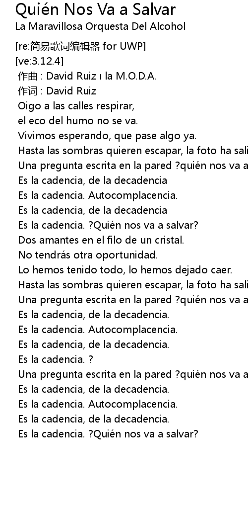 | [00:53.47] | Es la cadencia. ? Quié n nos va a salvar? |
