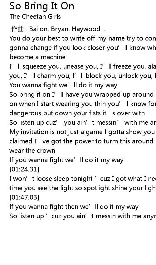 | [00:44.20] | So bring it on I' ll have you wrapped up around my finger So bring it on when I start wearing you thin you' ll know for sure I don' t wanna get dangerous put down your fists it' s over with |