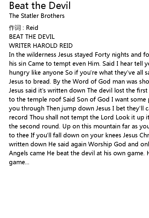 | In the wilderness Jesus stayed Forty nights and forty days The devil came in all his sin Came to tempt even Him. Said I hear tell you' re God' s Son But you get hungry like anyone So if you' re what they' ve all said Then turn these rocks Jesus to bread. By the Word of God man was shown He can' t live by bread alone Jesus said it' s written down The devil lost the first round. The devil took Him to the temple roof Said Son of God I want some proof If you' ve got Angels to see you through Then jump down Jesus I bet they' ll catch you. Jesus said Scriptires record Thou shall not tempt the Lord Look it up it' s written down The devil lost the second round. Up on this mountain far as you see All these things I' ll give to thee If you' ll fall down on your knees Jesus Christ and worship me. It' s written down He said again Worship God and only Him The devil left and the Angels came He beat the devil at his own game. He beat the devil at his own game... |