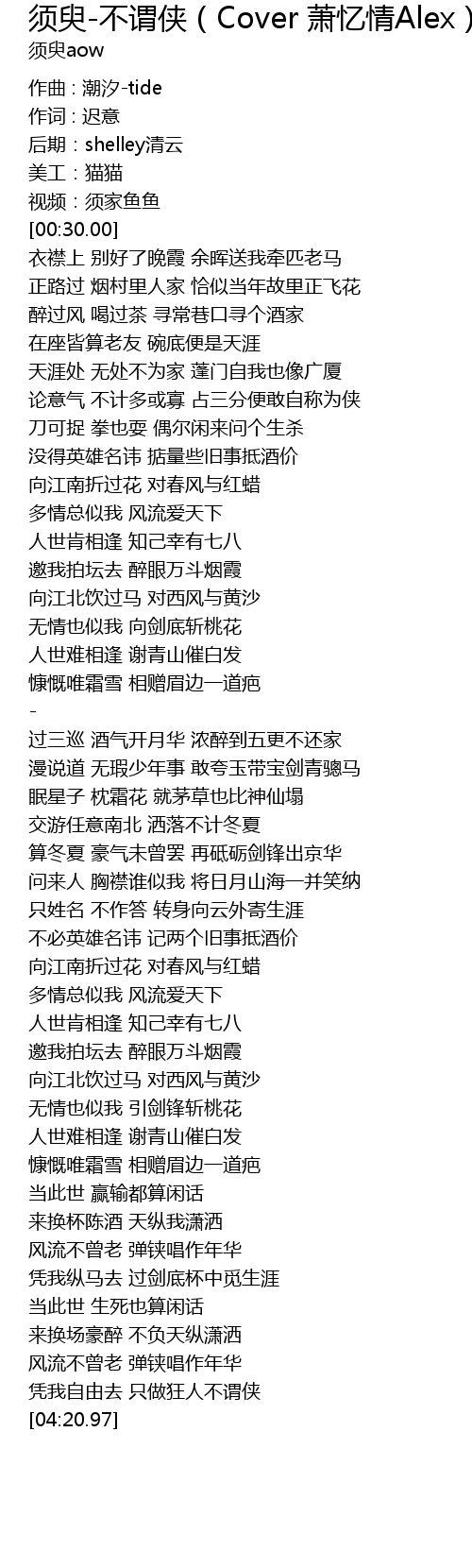 | Song | 须臾-不谓侠(Cover 萧忆情Alex) |