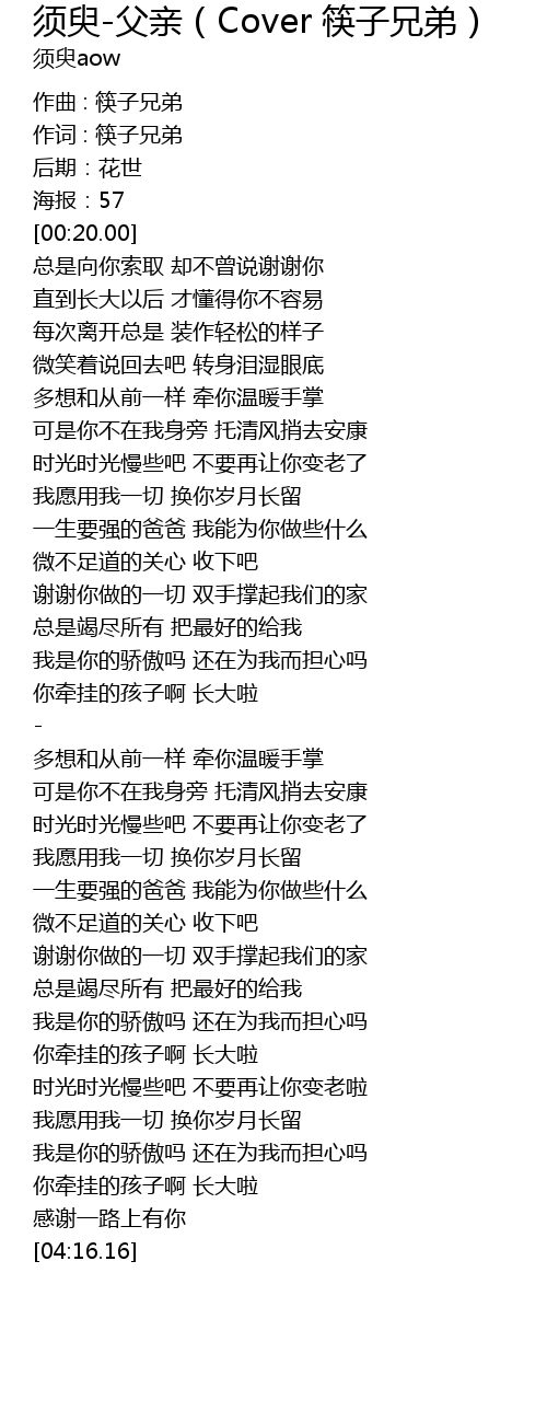 | Song | 须臾-父亲(Cover 筷子兄弟) |