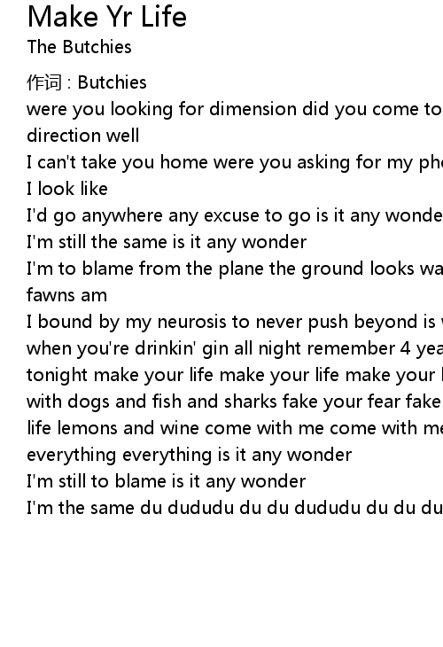 | I bound by my neurosis to never push beyond is what you want always with you when you' re drinkin' gin all night remember 4 years old if you could be that kid tonight make your life make your life make your life souls and stars swimming with dogs and fish and sharks fake your fear fake face fake your fear make your life lemons and wine come with me come with me all we need is everything everything everything is it any wonder | |