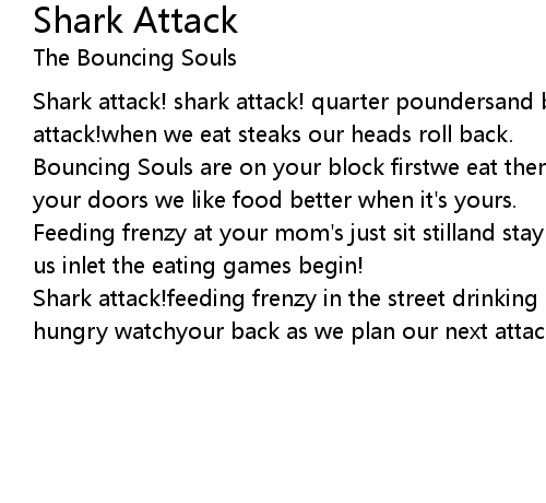 | Shark attack! shark attack! quarter poundersand big macs shark attack! shark attack!when we eat steaks our heads roll back. | |