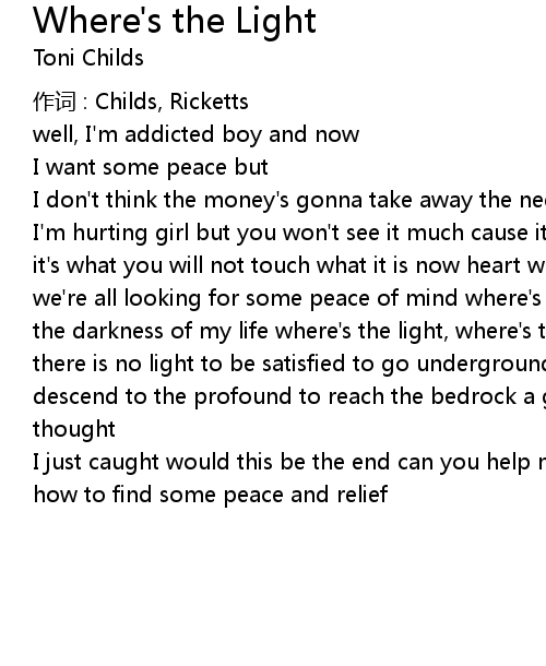 | I' m hurting girl but you won' t see it much cause it' s the stuff we don' t let out it' s what you will not touch what it is now heart what we need to find it seems we' re all looking for some peace of mind where' s the light, where' s the light in the darkness of my life where' s the light, where' s the light in the darkness there is no light to be satisfied to go underground to swim inside the ocean descend to the profound to reach the bedrock a guest a psychic death a wild thought | |