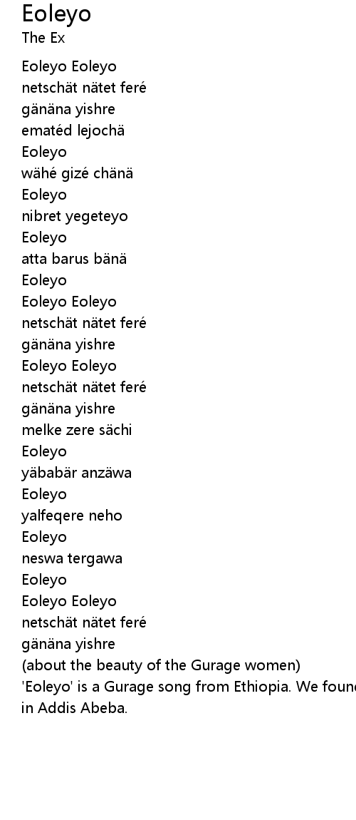 | ' Eoleyo' is a Gurage song from Ethiopia. We found it on a Mahmoud Ahmed cassette in Addis Abeba. |