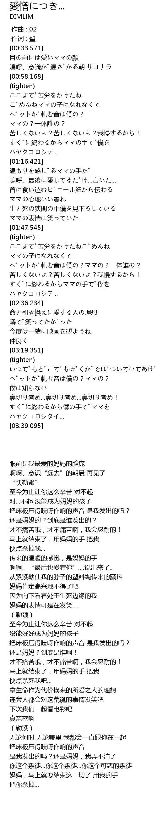 | [03:25.058] | ベットが軋む音は僕の?ママの? 僕は知らない |