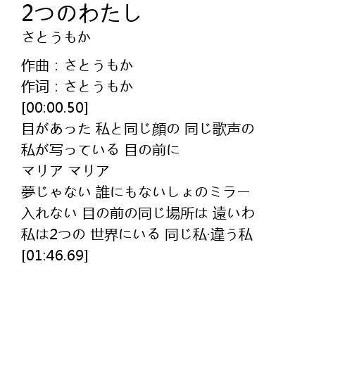 | [00:14.11] | 目があった 私と同じ顔の 同じ歌声の |