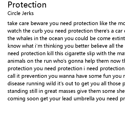 take care beware you need protection like the monkey in the jungle don't slip watch the curb you need protection there's a car coming your name's on it but the whales in the ocean you could be come extint don't let them haunt us you know what i'm thinking you better believe all the animals need protection you need protection kill this cigarette slip with the matches brush fires burning animals on the run who's gonna help them now there's nowhere to go you need protection you need protection i need protection too in a square package some call it prevention you wanna have some fun you need protection there's a killer disease running wild it's out to get you all those people they need protection standing still in great masses give them some shelter there's a nuclear rain coming soon get your lead umbrella you need protection i need protection too |