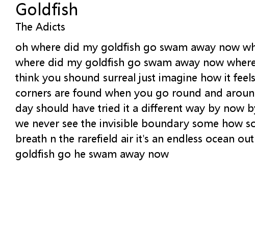 oh where did my goldfish go swam away now where did my golfish go oh oh! oh where did my goldfish go swam away now where did my golfish go oh oh! so you think you shound surreal just imagine how it feels outside no surprises at corners are found when you go round and around and around day after day after day should have tried it a different way by now by now but t's the glass walls we never see the invisible boundary some how so you think you sound surreal to breath n the rarefield air it's an endless ocean out there oh where did my goldfish go he swam away now |