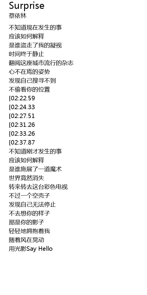 | [02:55.61][02:37.87][01:59.63][01:01.16] | Oh what a big surprise |