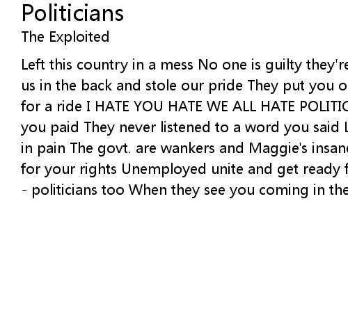Left this country in a mess No one is guilty they're innocent of theft Stabbed us in the back and stole our pride They put you on the dole que they took you for a ride I HATE YOU HATE WE ALL HATE POLITICIANS Financed murder from the tax you paid They never listened to a word you said Left us in poverty they left us in pain The govt. are wankers and Maggie's insane Now is the time to stand up for your rights Unemployed unite and get ready for the fight The army the police - politicians too When they see you coming in they just won't have a clue |