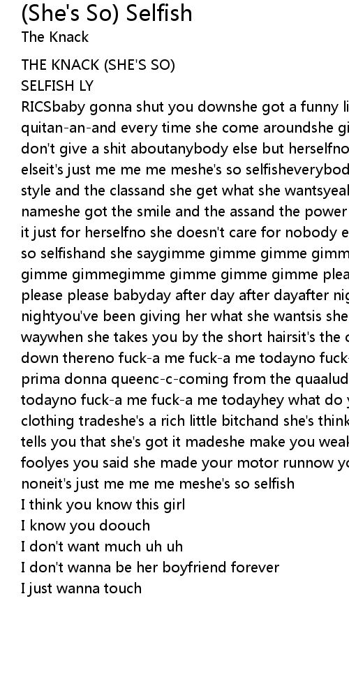 RICSbaby gonna shut you downshe got a funny little facebut her body don't quitan-an-and every time she come aroundshe give a wiggle and a winkbut she don't give a shit aboutanybody else but herselfno she doesn't care for nobody elseit's just me me me meshe's so selfisheverybody plays her gameshe got the style and the classand she get what she wantsyeah and everybody knows her nameshe got the smile and the assand the power to flaunt'cause she's really in it just for herselfno she doesn't care for nobody elseit's just me me me meshe's so selfishand she saygimme gimme gimme gimmegimme gimme gimme gimmegimme gimme gimme gimmegimme gimme gimme gimme pleaseoh won't you give it to me please please please babyday after day after dayafter night after night after nightyou've been giving her what she wantsis she giving you what you needno waywhen she takes you by the short hairsit's the only thing she'll leave you down thereno fuck-a me fuck-a me todayno fuck-a me fuck-a me todayshe's the prima donna queenc-c-coming from the quaalude sceneno fuck-a me fuck-a me todayno fuck-a me fuck-a me todayhey what do you sayshe's been working in the clothing tradeshe's a rich little bitchand she's thinking she's coolwhen she tells you that she's got it madeshe make you weak in the kneeslike a love sick foolyes you said she made your motor runnow you know she'll never give you noneit's just me me me meshe's so selfish |