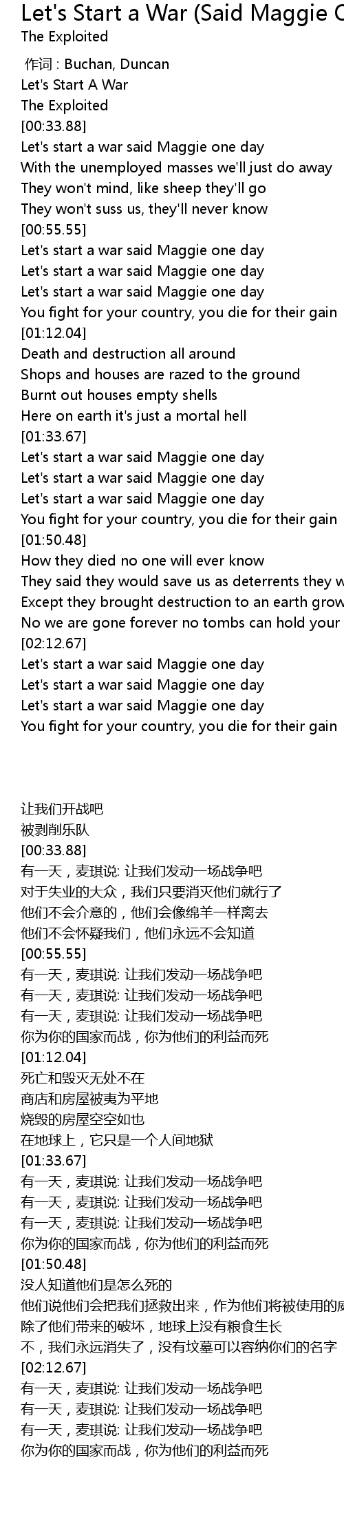 | [00:33.89] | Let' s start a war said Maggie one day |