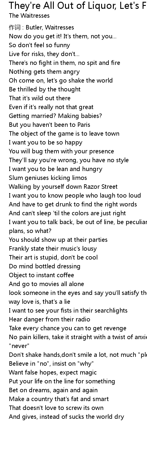 | Song | They're All Out of Liquor, Let's Find Another Party |