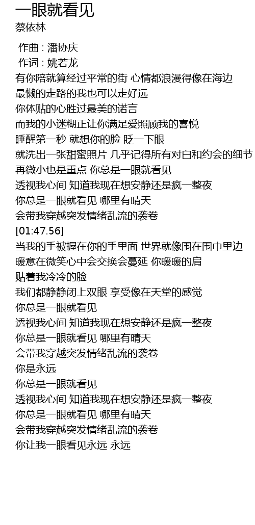 | [02:34.11] | nǐ zǒng shì yī yǎn jiù kàn jiàn |