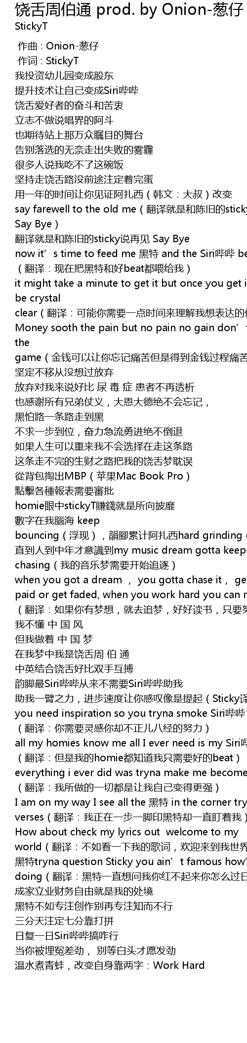 | [01:53.28] | 黑特tryna question Sticky you ain’t famous how’s your wallet doing(翻译:黑特一直想问我你红不起来你怎么过日子呢?) |