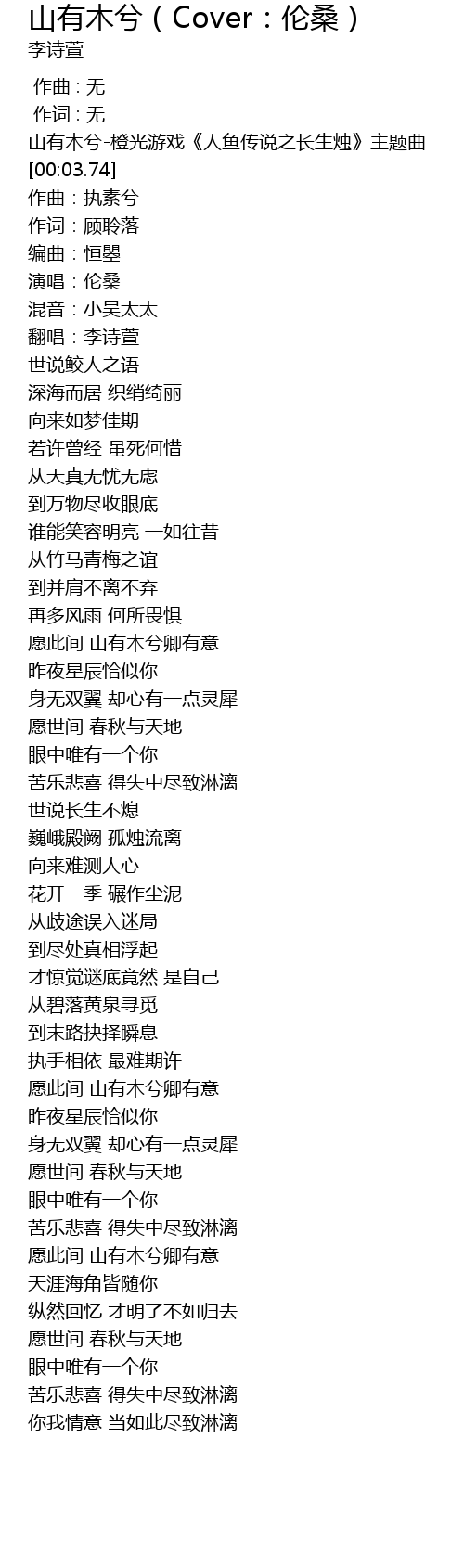 | [00:00.00] | 山有木兮-橙光游戏《人鱼传说之长生烛》主题曲 |