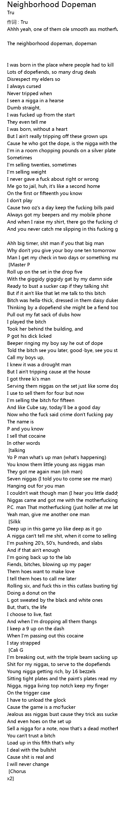 | Yeah, huh, your neighborhhood dopeman [Master P & dopefiend: talking] [Chorus x2] |