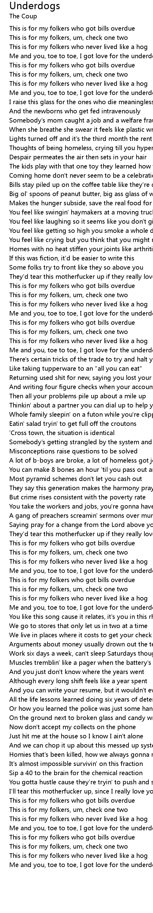 Me and you, toe to toe, I got love for the underdog |