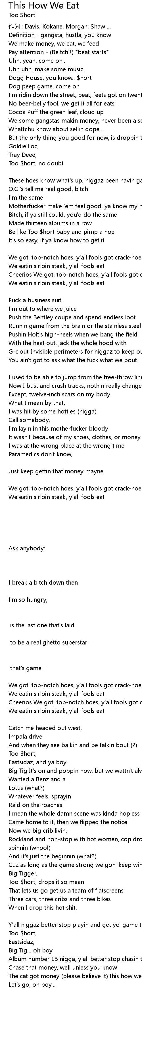 | Tell 'em how we eat and what we all about, nigga [Too $hort] | |