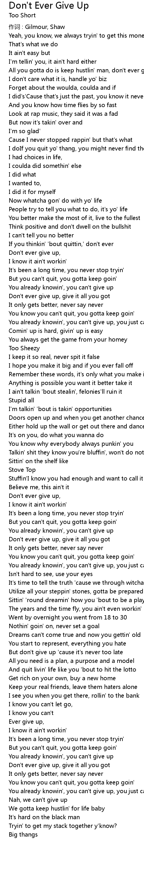 | All you gotta do is keep hustlin' man, don' t ever give up | |