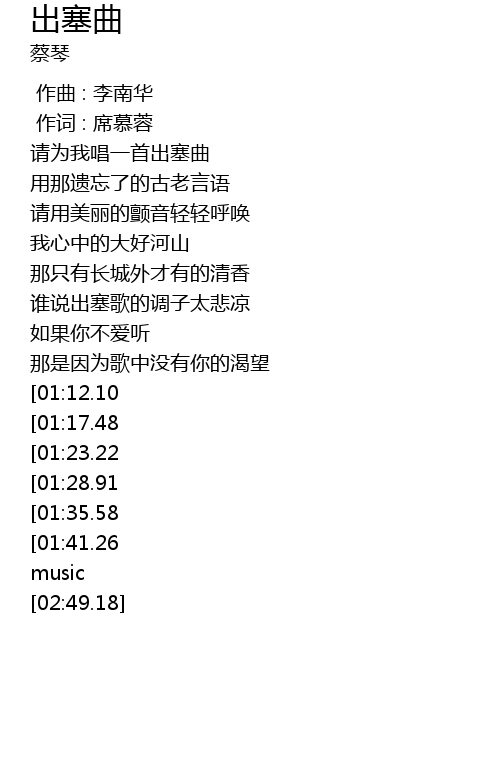 | [00:25.71] | 请为我唱一首出塞曲 |