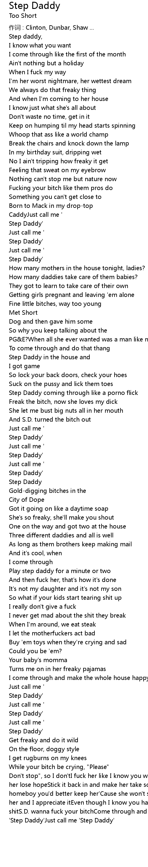 | Don' t stop", so I don' tI fuck her like I know you won' tPull out my dick and make her lose hopeStick it back in and make her take some notesIf that' s your bitch, homeboy you' d better keep her' Cause she won' t stay off my beeperYou can' t fuck her and I appreciate itEven though I know you hate itI keep getting that good shitS. D. wanna fuck your bitchCome through and make the hoe so happyJust call me ' Step Daddy' Just call me ' Step Daddy' |