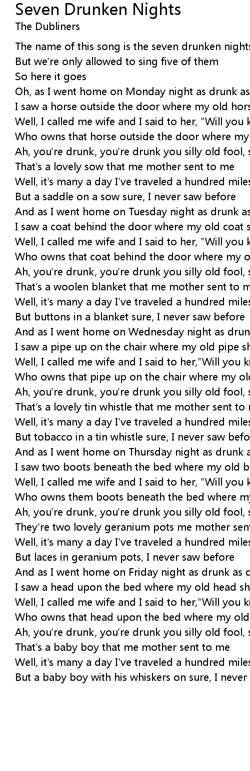 Oh, as I went home on Monday night as drunk as drunk could be |