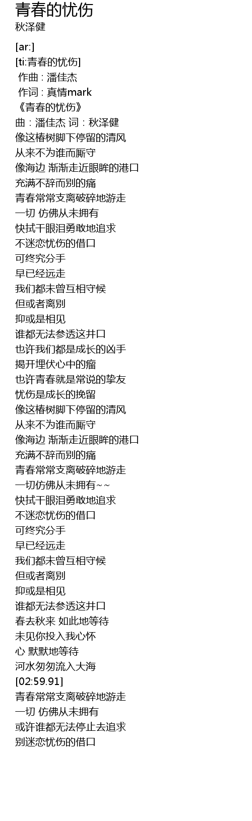 [00:04.16] 曲:潘佳杰 词:秋泽健