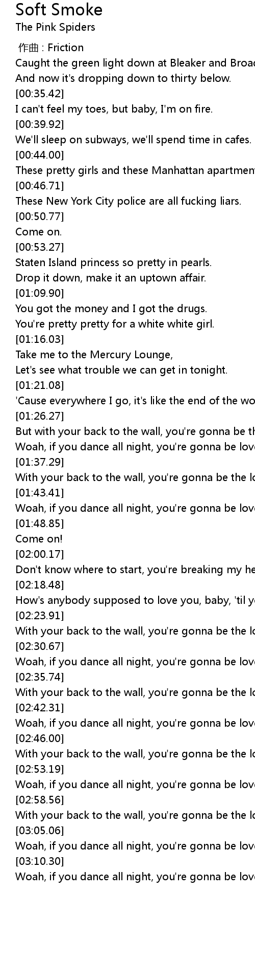 | [03:02.06] | With your back to the wall, you're gonna be the lonely one. |