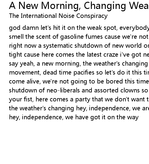 god damn let's hit it on the weak spot, everybody knows that we all had enough smell the scent of gasoline fumes cause we're not victims and we know what to do right now a systematic shutdown of new world orders and restructuring plans hold tight cause here comes the latest craze i've got news baby and this is what i say yeah, a new morning, the weather's changing god damn let's build a new movement, dead time pacifies so let's do it this time all these slogans will come alive, we're not going to be bored this time right now a systematic shutdown of neo-liberals and assorted clowns so strike the match and baby clench your fist, here comes a party that we don't want to miss yeah, a new morning, the weather's changing hey, independence, we are playing a little game, i said hey, independence, we have got it on the way |
